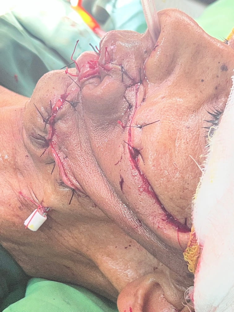 80 years old male suffering from right buccal mucosa carcinoma with anterior 2/3 tongue lesion.patient was operated for central arch lower GB sulcus carcinoma .central arch mandibulectomy with reconstruction with bilobe PM flape done before 1 year.Right buccal mucosa growth excision with right nasolabial flape with right anterior 2/3 tongue lesion excision done.